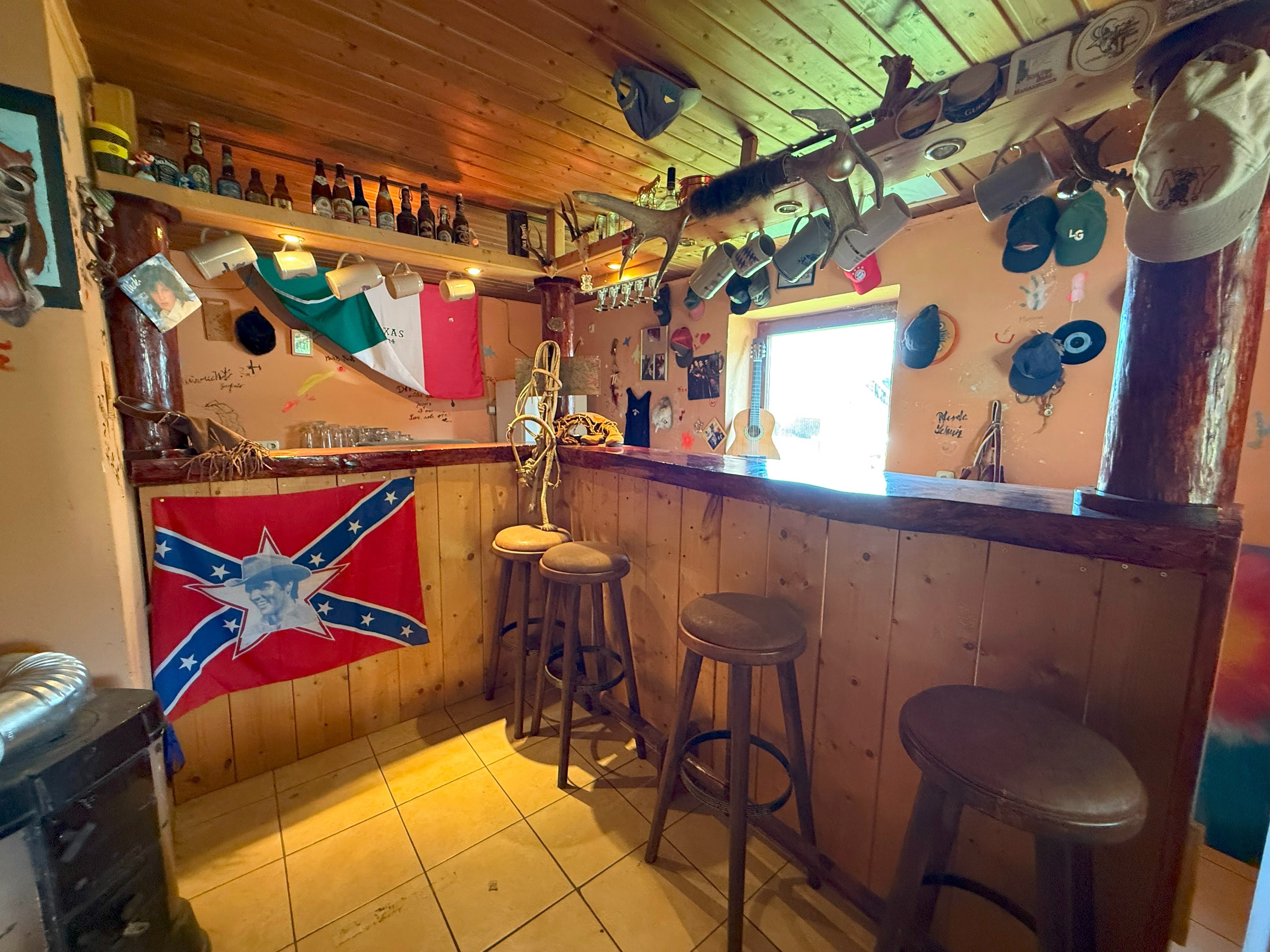 EG: Saloon-Bar mit Theke sowie ein weiterer großzügiger Raum, der aktuell als Wohn-/Schlafzimmer genutzt wird; Toilette (Herren WC)