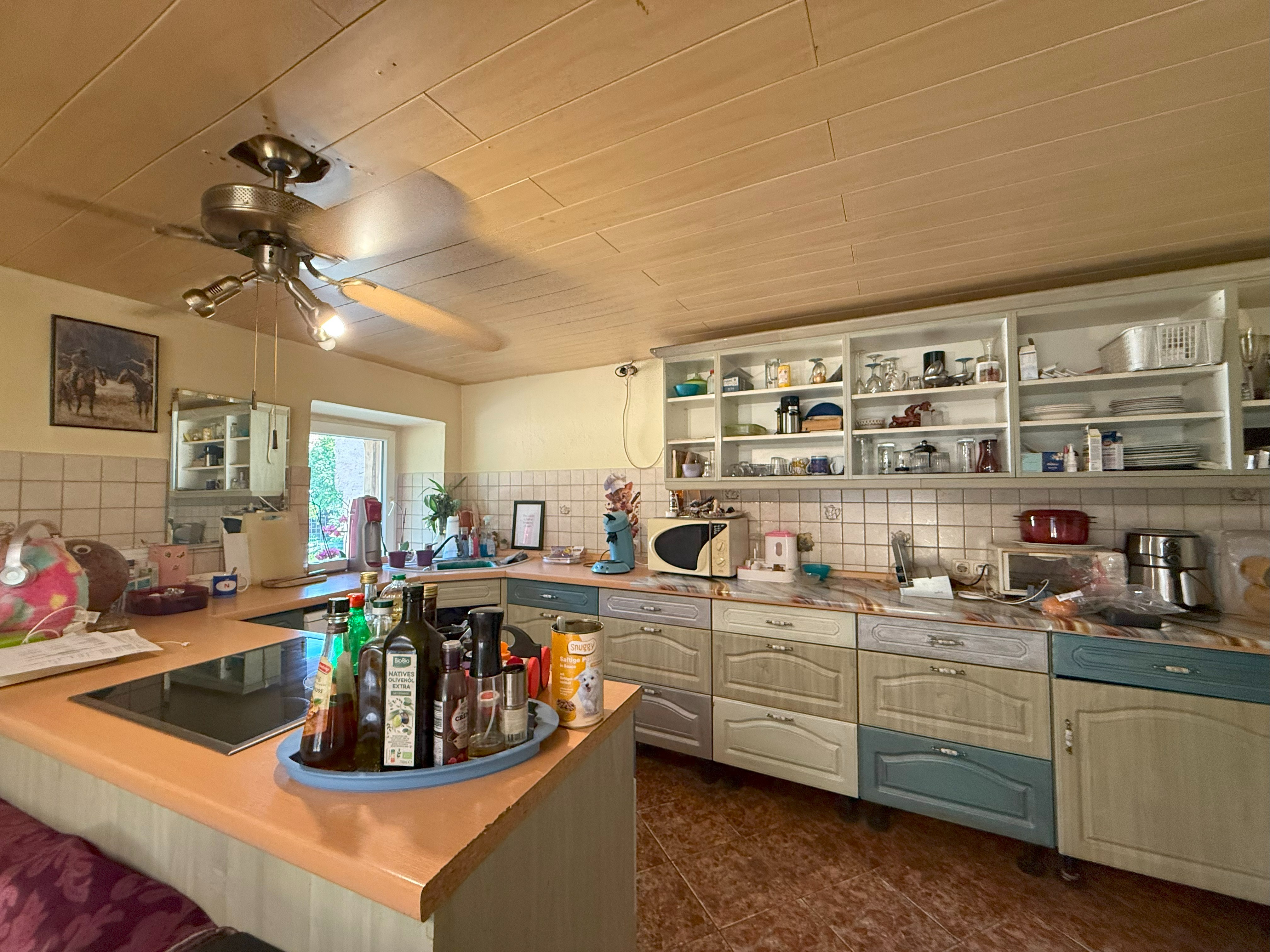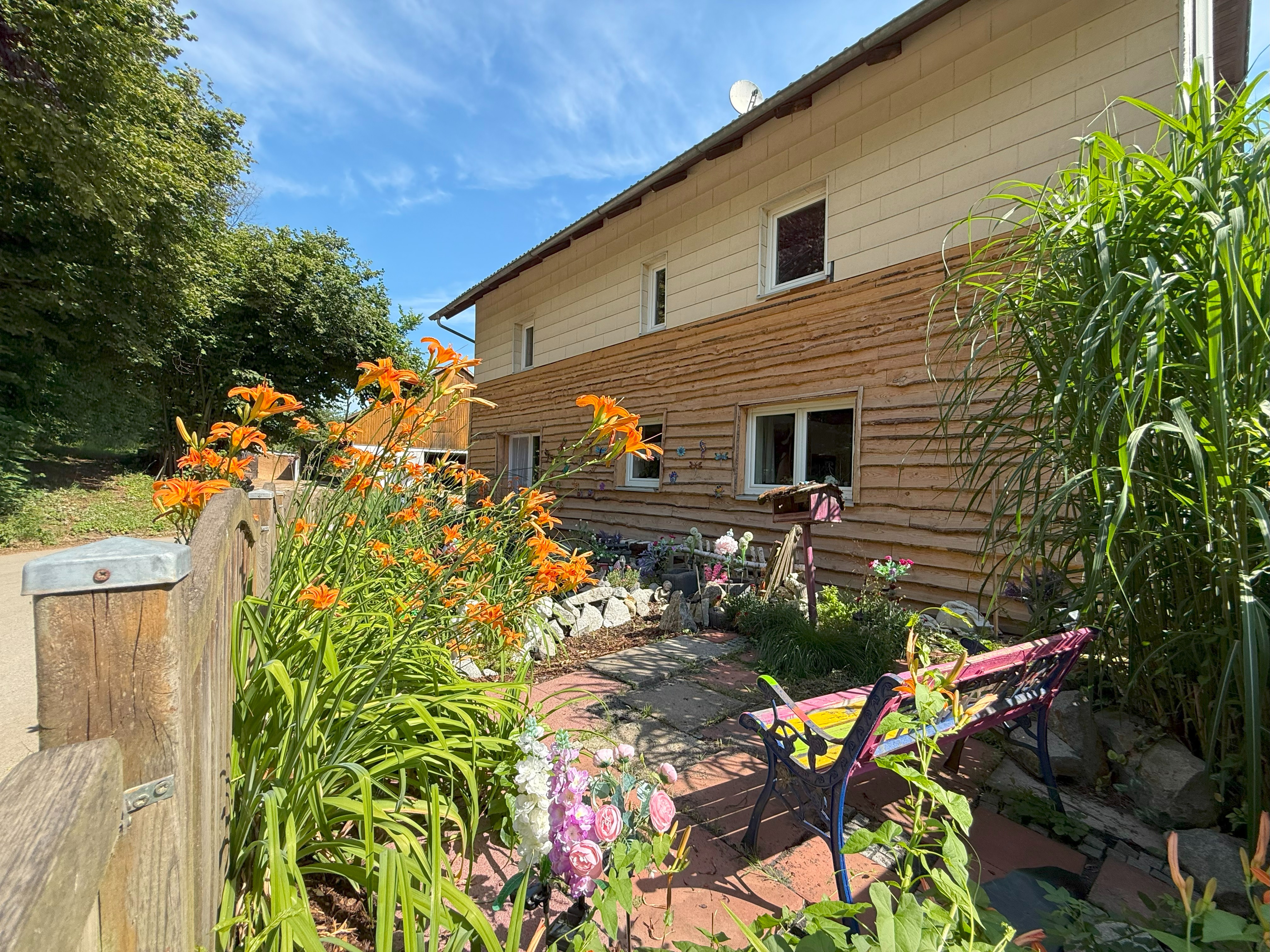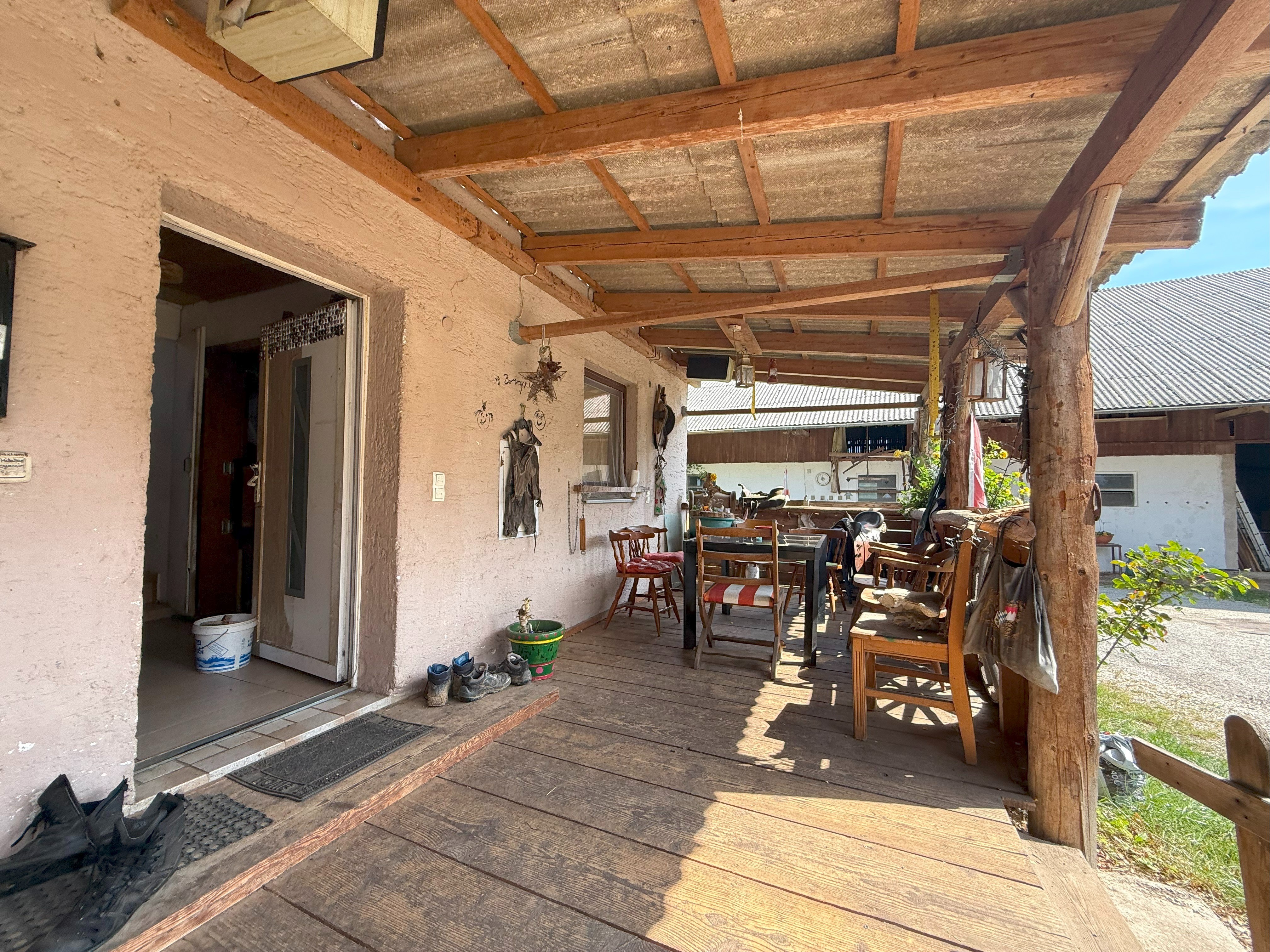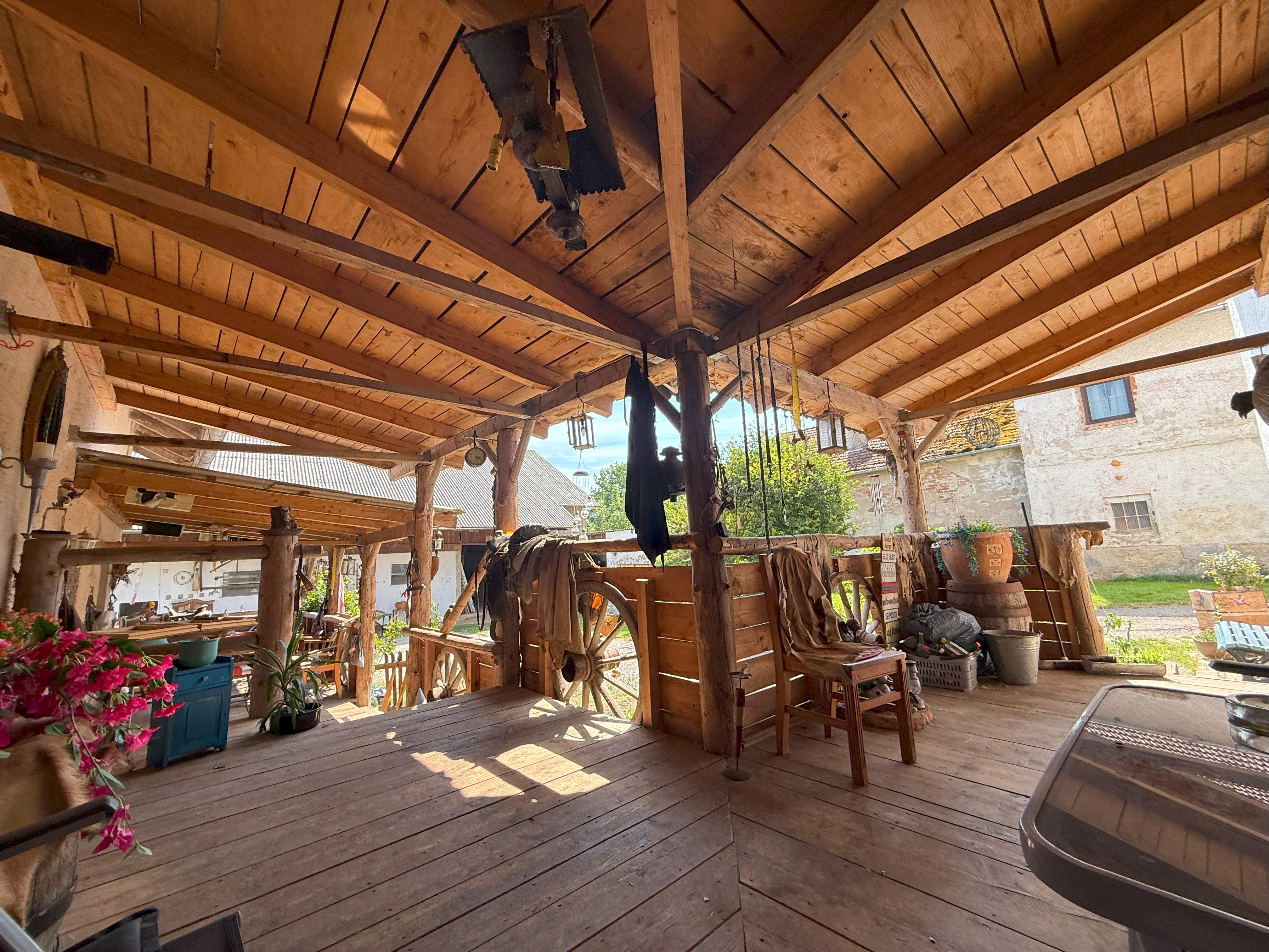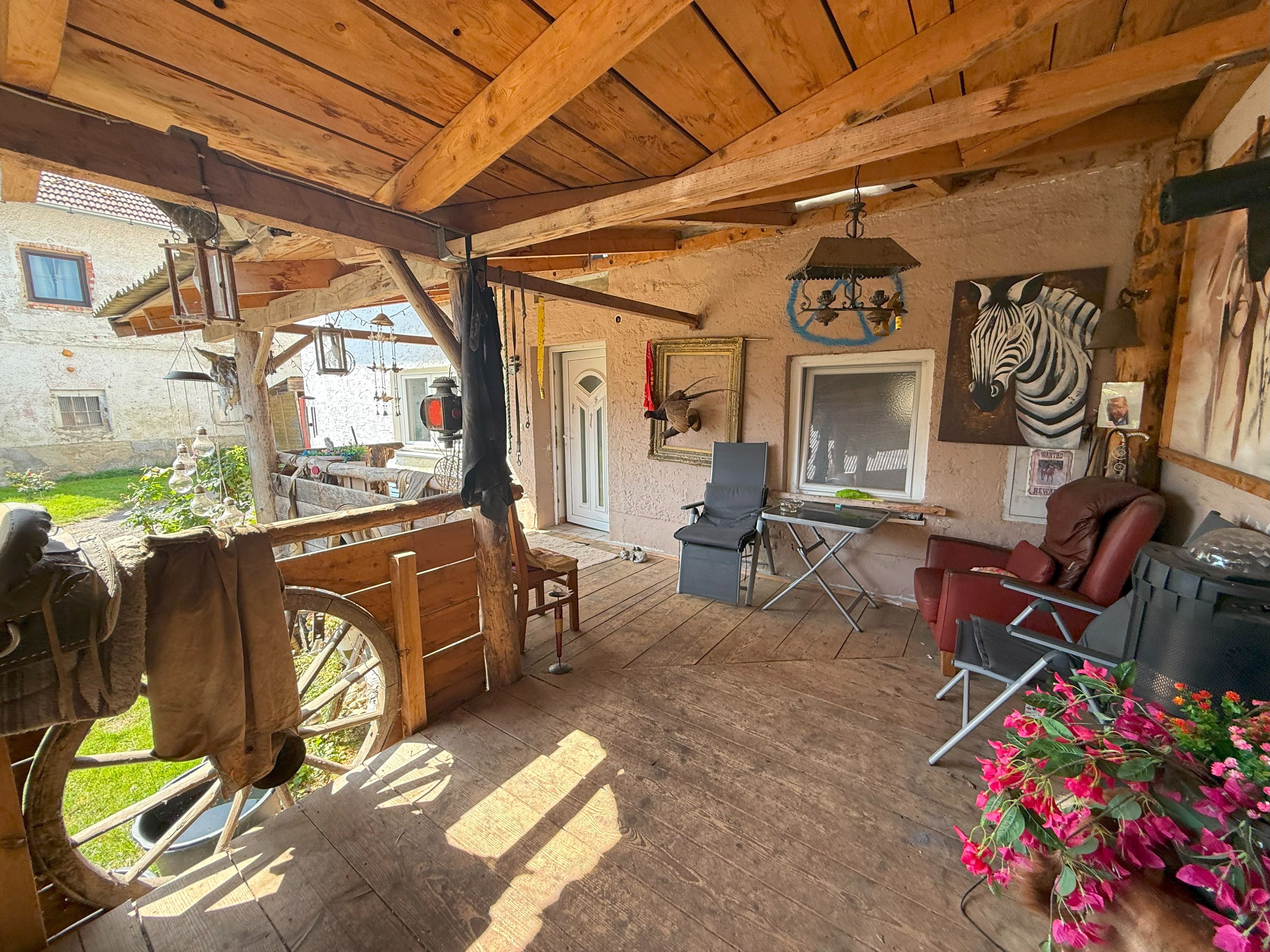 Zum Anwesen, das sich auf einem rund 1.700 m² großen Grundstück erstreckt, gehören neben dem Haupthaus ein angebautes Einfamilienhaus mit Veranda, ein Nebengebäude sowie eine Stallung.