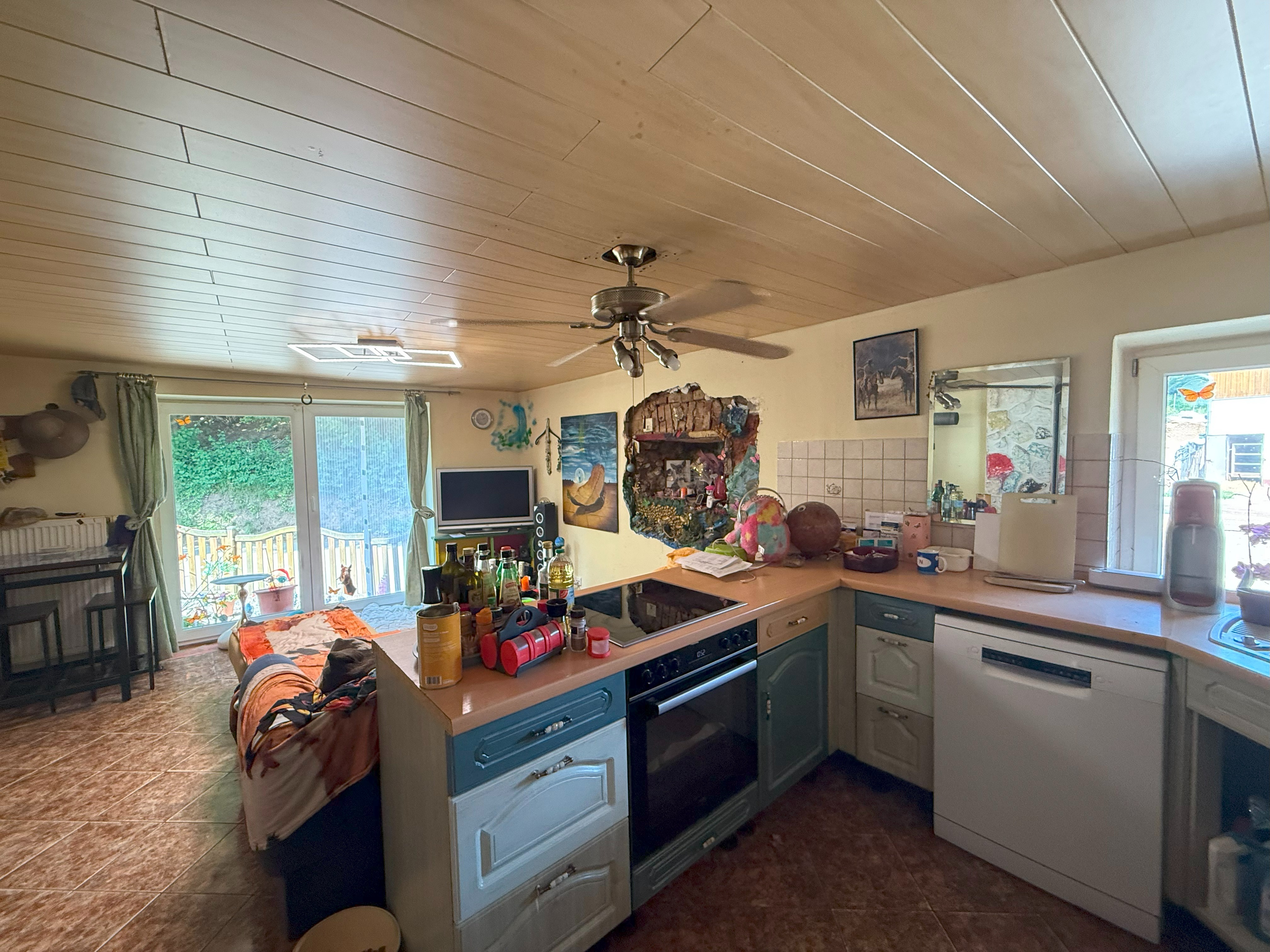 EG: Wohnküche mit Zugang zur Terrasse, Badezimmer mit Eckbadewanne und Waschmaschinenanschluss sowie 2 Schlafzimmer; dieser Gebäudeteil ist unterkellert.