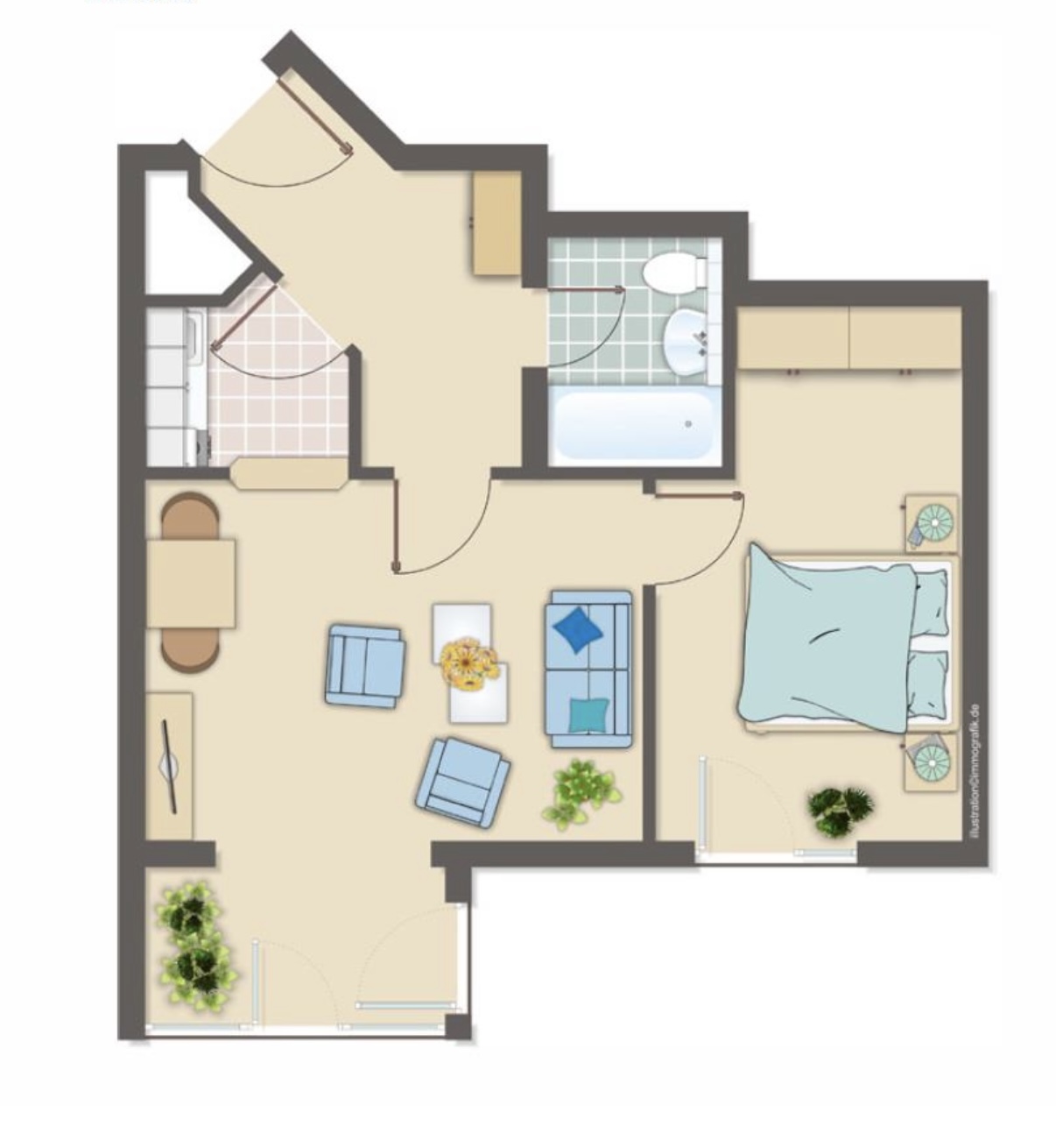 Sie verfügt über insgesamt 44 qm und bietet Flur/Eingangsbereich, Wohnbereich mit Zugang zum Wintergarten, 1 Schlafzimmer, Küche mit Einbauküche und Badezimmer mit Wanne.